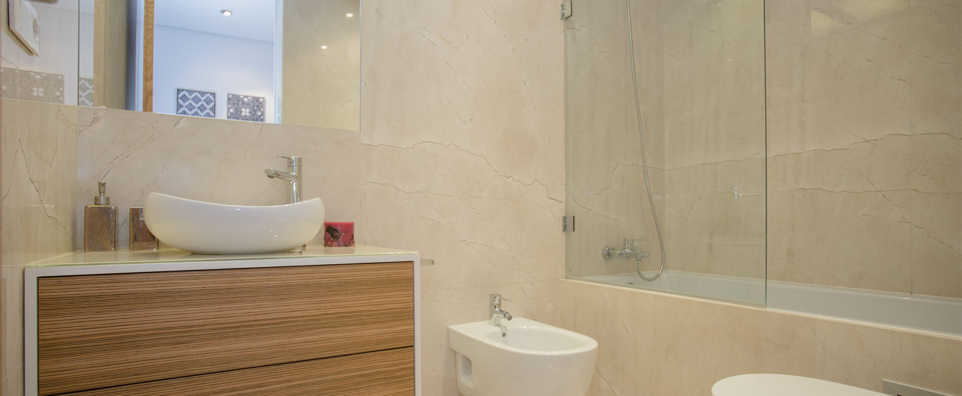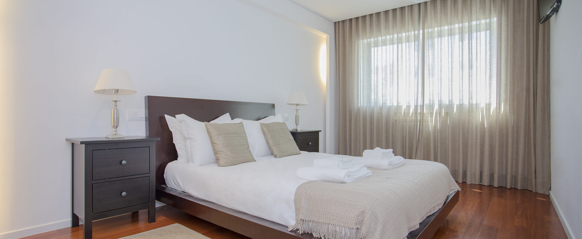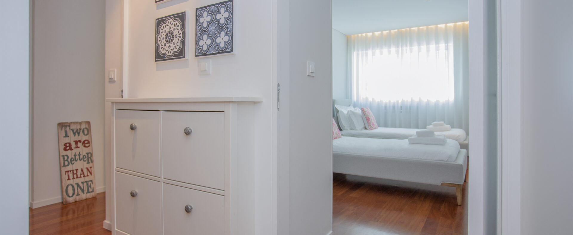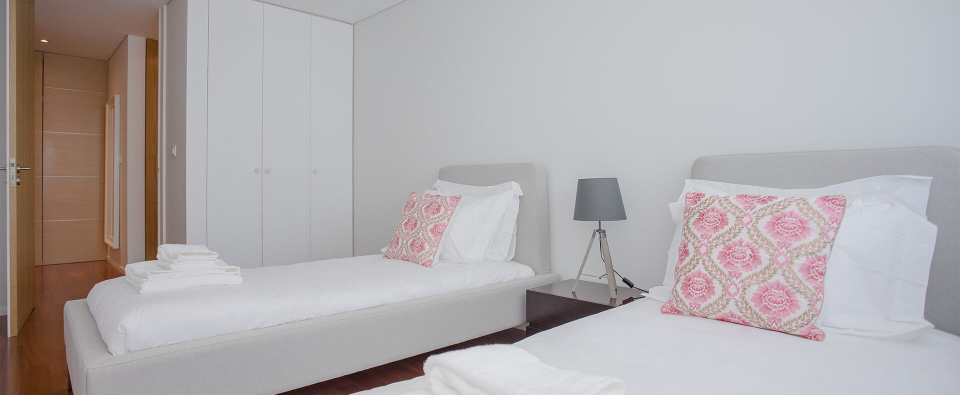 O apartamento tem dois quartos, um suite, com cama de casal e chuveiro, e outro com duas camas de solteiro; tem outra casa-de-banho, com banheira; uma sala de estar com TV de ecrã plano, com canais cabo, e Wifi; a cozinha tem tudo para a sua estadia, incluindo máquinas de lavar a roupa e loiça.
