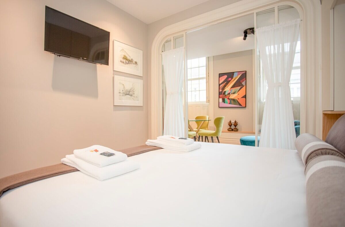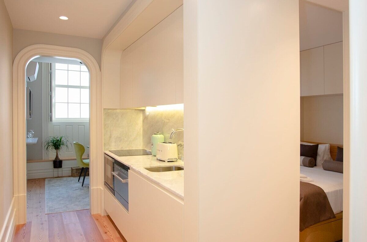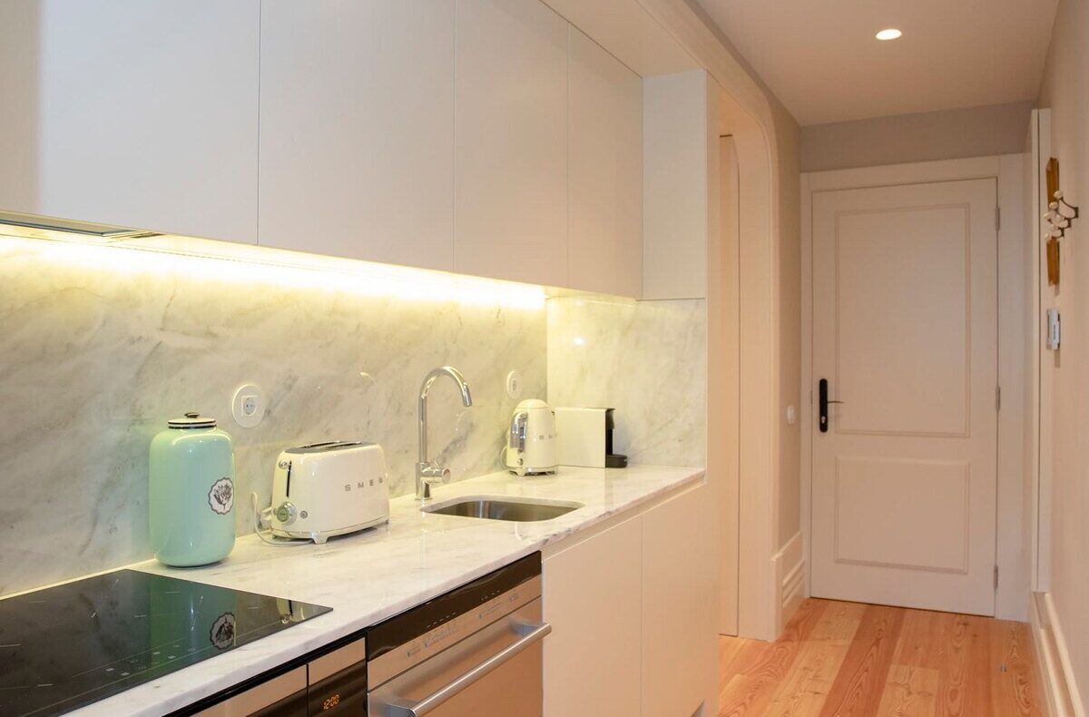 O apartamento dispõe de 01 quarto de casal, sala de estar com Smart TV, uma cozinha totalmente equipada e uma casa-de-banho com todas as amenities necessárias para o conforto da sua estadia.
